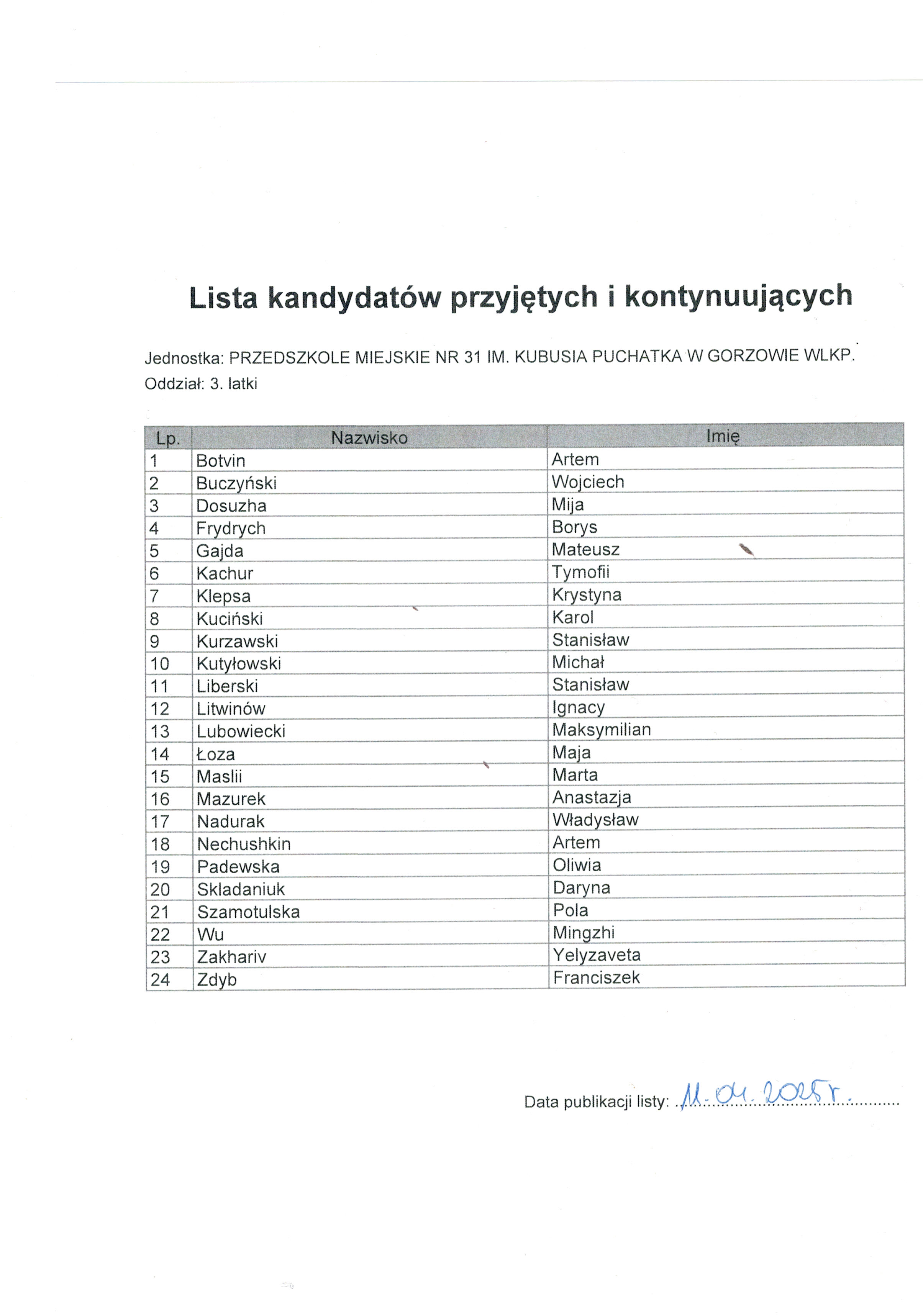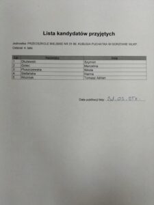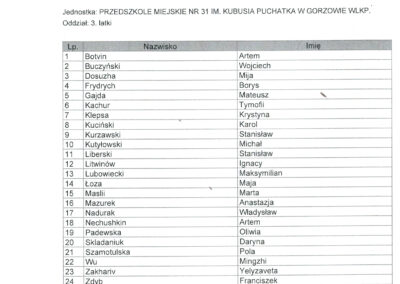LISTY KANDYDATÓW PRZYJĘTYCH DO PRZEDSZKOLA MIEJSKIEGO NR 31 W GORZOWIE WIELKOLSKIM